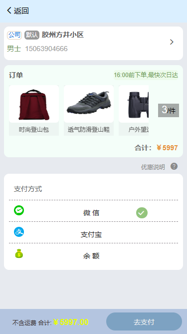 订单支付页:购物车界面点击去结算会跳转到该界面,查看相关信息是否正确去支付即可。