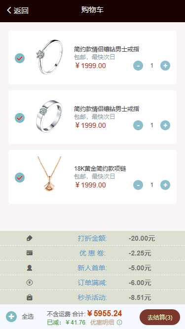 2. 展示用户所要购买的商品列表,以及优惠详情;
