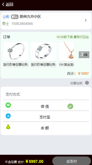 订单支付页:购物车界面点击去结算会跳转到该界面,查看相关信息是否正确去支付即可。