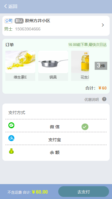 订单支付:选择好饮品后点击支付按钮进入该页面进行付费;