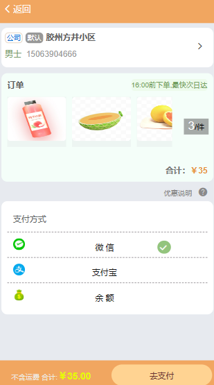 订单状态:购物车界面点击去结算跳转到该界面,查看相关信息是否正确去支付即可。