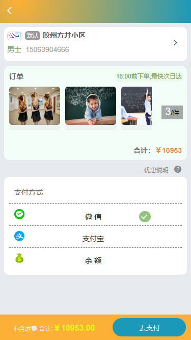 订单状态:购物车界面点击去结算跳转到该界面,查看相关信息是否正确去支付即可。